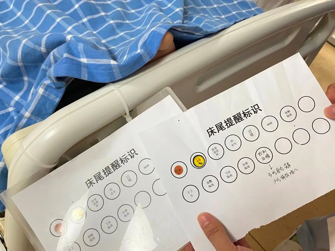 2、责任护士为不同患者设置床位提示卡,提示护理人员及陪护该患者的护理重点,例如肢体有无血栓、患者的饮食需额外增加蛋白/水果/营养粉等、患者测血糖的特殊时间点规定等等,获得患者及家属的一致好评。家属黄先生表示床位提示卡设置之后,自己在陪护患者的过程中更加清晰,在饮食及日常生活的护理上也会注意按照提示卡的内容来做,方便了不少。