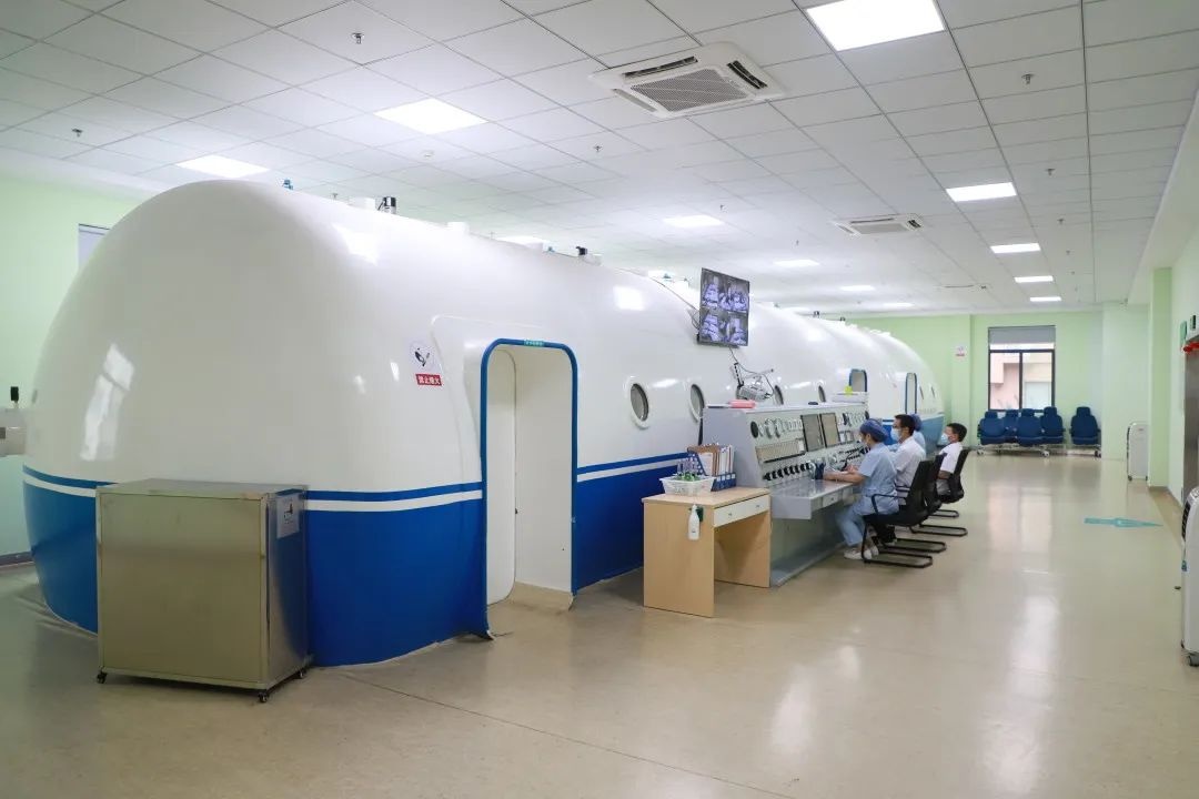 配备36人国内先进空气加压大型氧舱群,以重症治疗和康复标准建立,由治疗舱、过渡舱、ICU舱组成,配置氧舱专用呼吸机、有线心电监护仪、吸引装置等急救设备。医疗团队具备对危重症患者的病情变化的判断及急救处理能力,可充分保障戴呼吸机、意识障碍患者的高压氧治疗需求及安全。