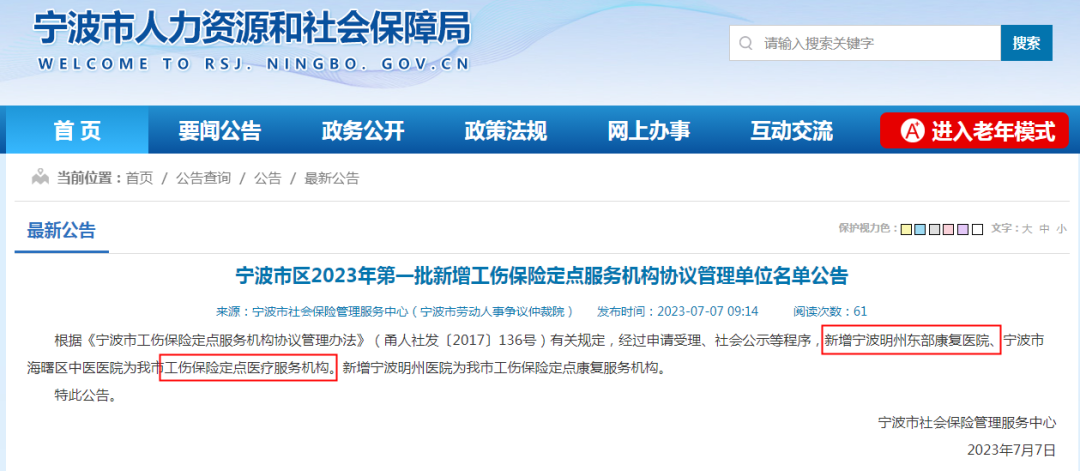 为规范参保单位工伤职工医疗和康复行为,近日,宁波市人力资源和社会保障局公布了宁波市工伤定点服务协议的医疗机构名单,我院成为宁波市工伤保险定点医疗机构。