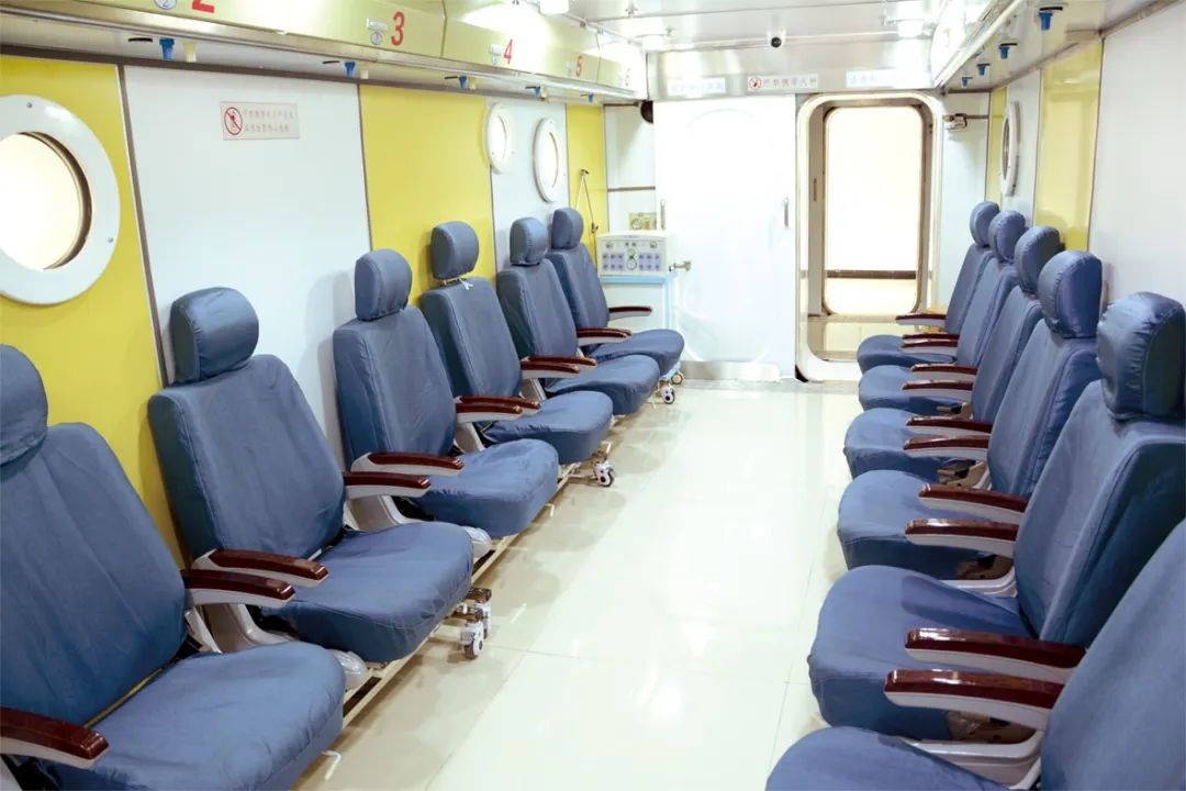 浙江明州康复医院高压氧方舱内配设舱内呼吸机、负压吸引、输液架等装置,便于在舱内进行抢救、监护、输液等操作。舱室内集常规吸氧、雾化吸氧和急救吸氧于一体的多功能吸氧装具盒,可满足不同的吸氧方式需要。舱内配置专用多功能呼吸机6台,过渡舱一个,可以同时容纳16人进行高压氧治疗,尤其利于开展危重病人的救治及一氧化碳等有害气体中毒治疗、脑外伤,脑卒中等缺氧性疾病治疗、肿瘤化疗术后恢复性治疗等,疗效显著。