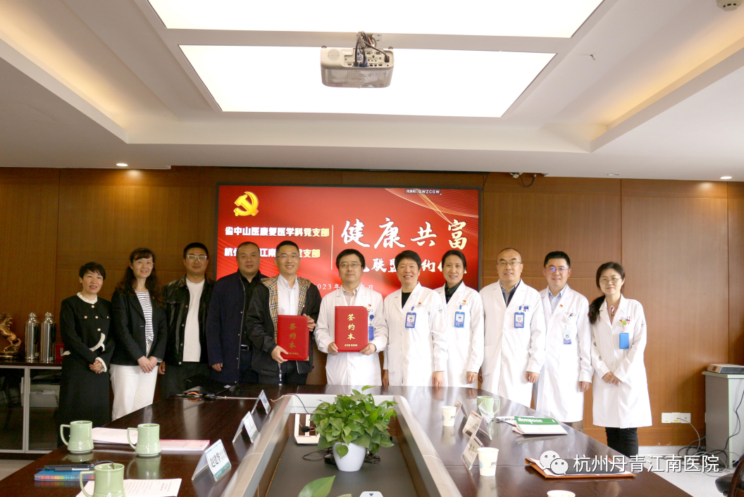 4月26日上午,中共浙江中医药大学附属第三医院康复医学科支部委员会与中共杭州丹青江南医院支部委员会在浙江省中山医院隆重举行“健康共富”红色联盟签约仪式。
