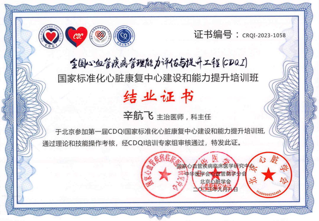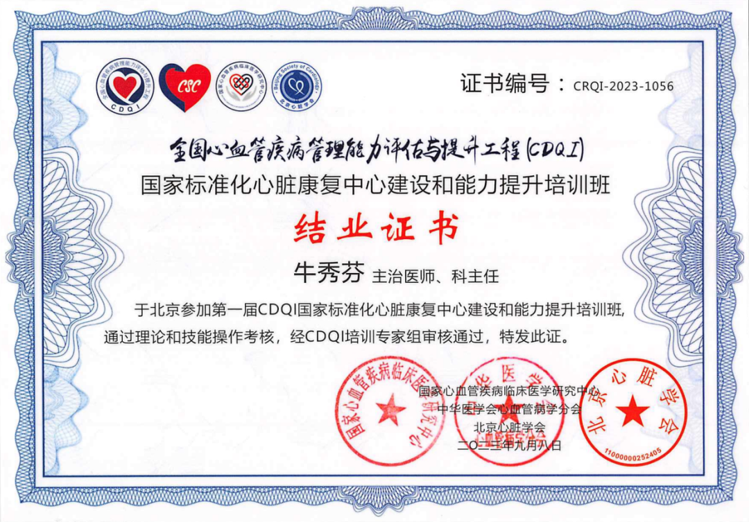 经过严格的培训及考试,杭州丹青江南医院牛朝霖主任、牛秀芬主任、辛航飞主任顺利拿到CDQI国家标准化心脏康复中心建设和能力提升培训班结业证书。