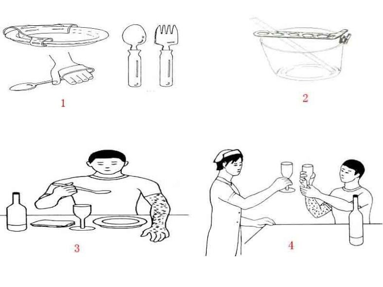 ① 进食训练 :积极督促脑出血后偏瘫患者独立完成一项进食活动 ,步骤包括手的抓握、上肢运动 、口腔咀嚼吞咽 ,所有动作连贯完成 。 如有必要可使用带套圈的筷子或者是粗柄勺子。