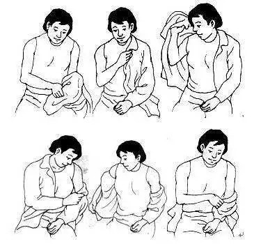 ⑥ 洗澡训练 :脑出血后偏瘫患者洗澡时选用高度适宜的塑料制椅子 ,擦洗背部时利用长柄刷辅助 。 拧毛巾时将毛巾夹于患侧的腋下部位或者是缠绕在患侧前臂 ,用力将毛巾拧干并擦拭全身 。