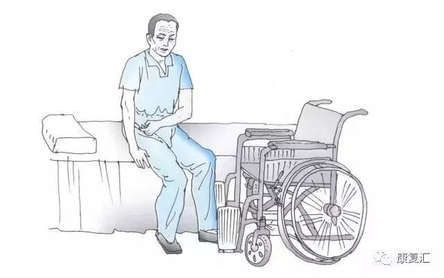 ④ 床椅转移训练 :患者能够坐稳后将轮椅推到病床前并与后者呈30°~45°,协助患者坐于床边 ,双脚着地后躯干前倾 ,以足部为轴心缓慢转移躯干 ,臀部正对轮椅后缓慢弯腰坐至轮椅。由轮椅向床上转移时反向进行 。