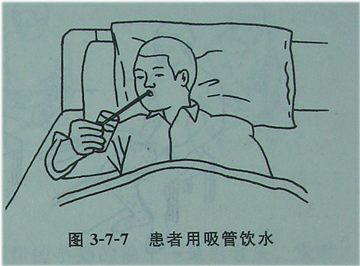 ③视空在失认、全盲的情况下,食物要按钟表的指针行走方向(顺时针)摆放,并告知患者摆放些什么样食品;④偏盲患者用餐时将食物放在健侧;⑤有吞咽障碍的患者必须先做吞咽动作的训练后再进行进食训练。要先用浓汤类或半固体类的食品,每次量不宜过多,并尽量放在舌后部,要稳要慢。饮水时要用吸管。