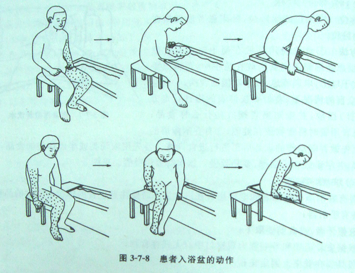 2.洗澡:①盆浴时患者坐在浴盆外椅子上(最好是术制椅子,高度与浴盆边缘相等),先用健手把患腿置于盆内后,再用健手握住盆沿,健腰撑起身体前倾,患者移至盆内椅子上,再把健腿放于盆内。另一种方法是患者将臀部移向浴盆内横板上,将盆外的两腿中的健腿放入盆内,然后帮助患腿入盆内。见图3-7-8。②淋浴时,患者可坐在椅子上或轮椅上,先开冷水管,再开热水管调节水温。洗澡的方法可用健侧手持毛巾擦洗或用长柄的海绵刷擦后背,如果患侧上肢肘关节以上有一定控制能力,可将毛巾一侧缝上布套,套在患臂上协助擦洗。毛巾拧干的方法是将其压在腿下或夹在病侧腋下.用健手拧干。