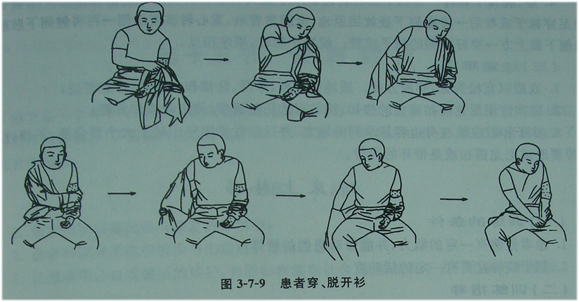1、穿、脱开身上衣:穿衣时应用健侧手找到衣领,将衣领超前平铺在双膝上,将患侧袖子垂直于双腿之间,患手伸入袖内—将衣领拉到肩上—健手转入身后将另一侧衣袖拉到健侧斜上方——穿入健侧上肢——系好扣子。脱衣时应将患侧脱至肩以下——拉健侧衣领到肩上——两侧自然下滑甩出健手。见图3-7-9。