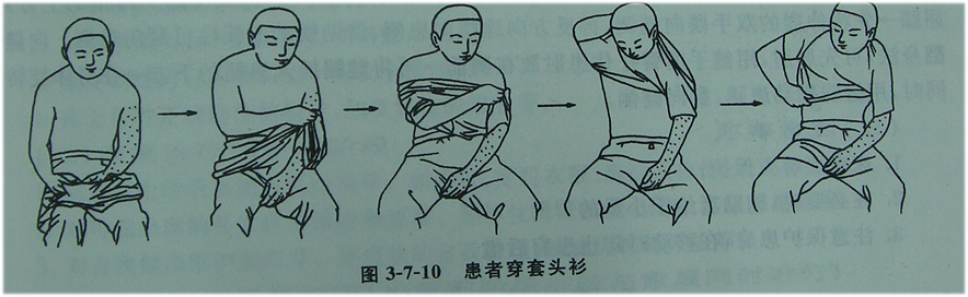2、穿、脱套头上衣:患手穿好袖子拉到肘以上—再穿健手侧的袖子—最后套头。脱时,先将衣身脱至胸部以上—再用健手将衣服拉住—在背部从头脱出—脱出健手—最后脱患手。见图3-7-10。
