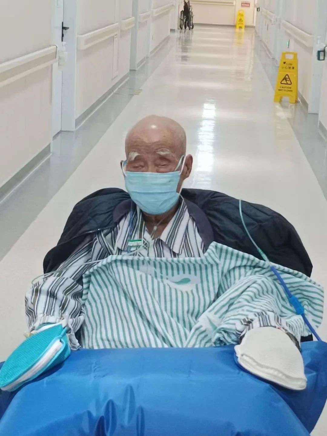 5月20日第一次坐轮椅,带上氧气包,推出病房的大门。