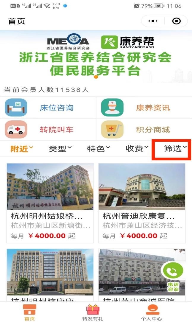 3、进入“智慧康养小程序”主界面,点击“筛选”按钮