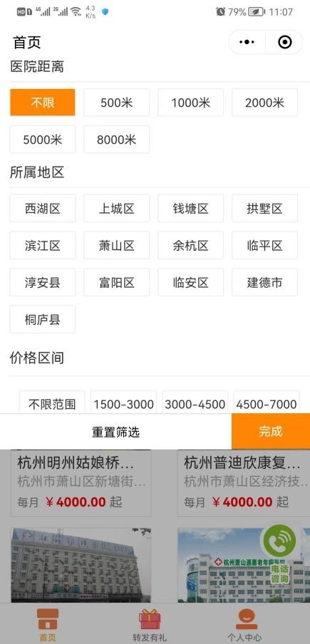 4、进入条件筛选界面,机构类型选择“康复医院”,特色优势选择“神经康复”,点击“完成”,还可根据需求选择“距离”“地区”以及“价格区间”