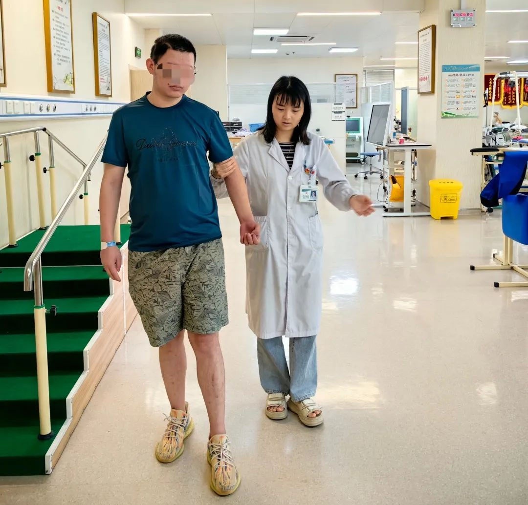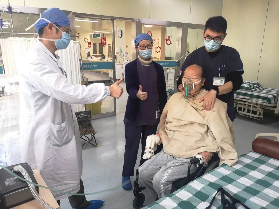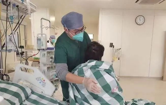 就在我一度想放弃治疗,精神也快到崩溃边缘的时候,康复师大鹏来到了我的身边,给我做康复训练。大鹏和护士们帮助我起床,为了转移苦痛,大鹏在治疗过程中会转移话题,他会讲北京冬奥会、俄乌战事以及最新时事新闻,讲一些身边成功的康复案例,聊起家长里短的小片段。就这样,开始只能坐几分钟,起来吃饭,吃了几口,肚子还没填饱,人已经撑不住了,腰不行,体能不行,垮了摊了;到后来,能够坚持10分钟,15分钟,每一次有进步,他和ICU团队的医生护士总是表扬我,给我竖大拇指,给我鼓励点赞,我就在他们的鼓励表扬中,一次次一点点多坐一会儿,多坚持一下。