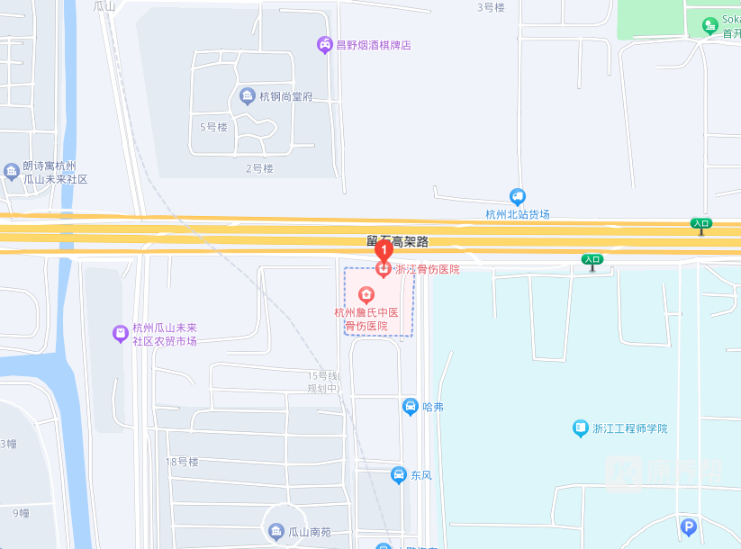 浙江骨伤医院座落于杭州市拱墅区上塘街道石祥路287号,地理位置便利,毗邻京杭大运河、留石高架路,附近有Sokapark首开公园和北星公园,周边环境宜人。医院地理优势明显,为患者提供便捷的就医通道,同时周围景色宜人,为患者提供舒适的就医环境。