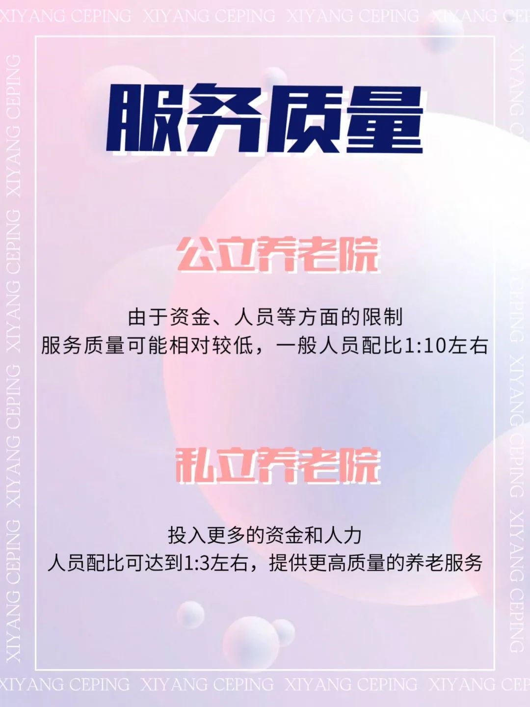 服务质量:由于资金、人员等方面的限制,公立养老院的服务质量可能相对较低,一般人员配比1:10左右。而私立养老院则通常会投入更多的资金和人力,比如有的高端养老院人员配比可达到1:3左右,提供更高质量的养老服务。
