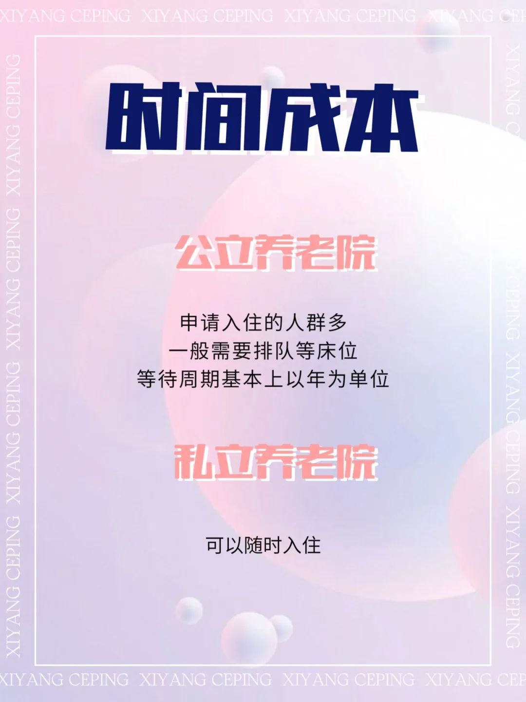 时间成本:公立养老院由于低廉的价格,申请入住的人群多,一般需要排队等床位,等待周期基本上以年为单位。私立养老院除了开的时间比较久以及地段非常好的,基本上都是可以随时入住。