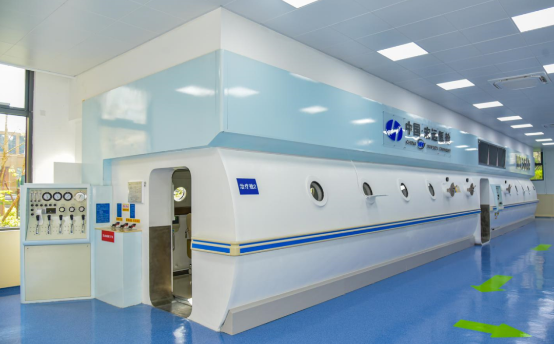 高压氧中心位于西溪院区西南侧6号楼(独栋),占地面积约648平方米,拥有GY3600M2-E6型36人新型高端平底氧舱群,为一舱三室七门,可容纳36名患者同时治疗。该氧舱群配备多功能呼吸气体医疗模块,每组模块均具备常规吸氧(呼吸调节器自动供氧)、无阻力一级吸氧、雾化吸氧和负压吸引接口及无触点感应式紧急呼叫报警装置五种功能。同时配备舱内心电监护仪、舱内气动呼吸机(北京易世恒SH-100),为需要呼吸机支撑治疗的危重病人创了超早期抢救康复的条件。