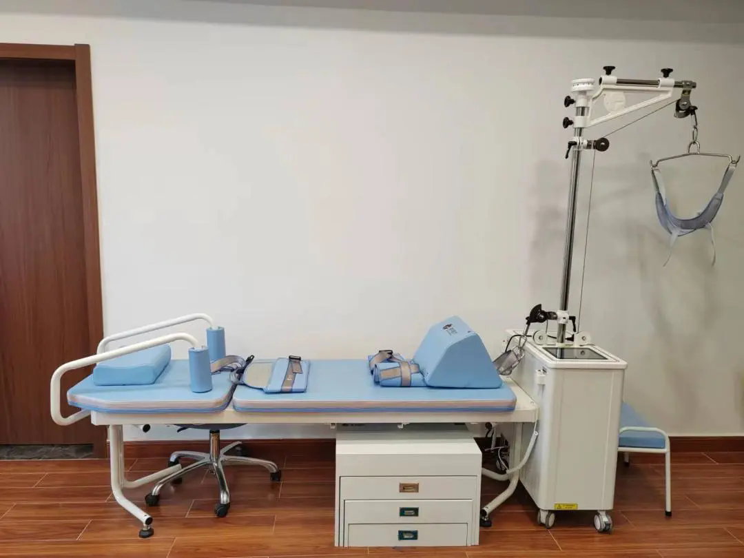 中医和康复科新增并已投入使用了许多高精尖仪器设备:颈腰牵引床、立体动态干扰电治疗仪、红外光灸疗机等