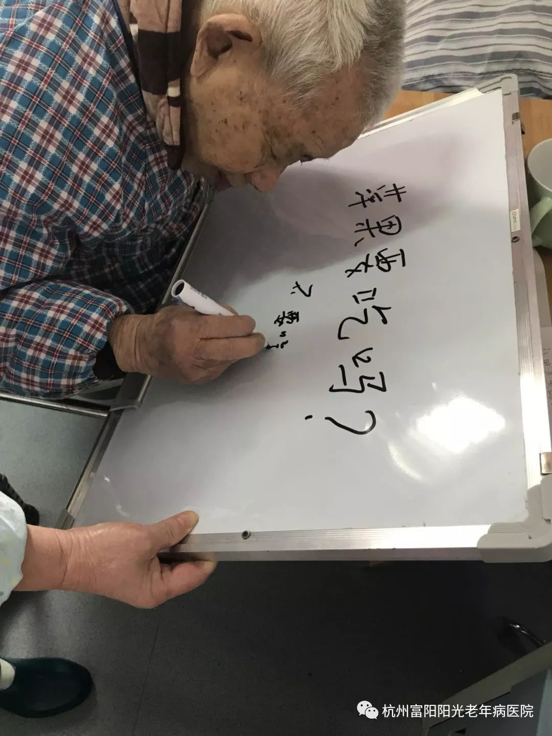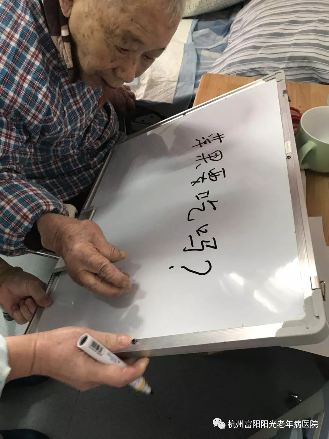 裘老先生入院以来都是高雪芬照顾她的饮食起居。裘老目前状态是言语交流不行,听力正常,文字交流可以,下肢肌力4级……平时和高大姐交流都是通过写字,每当高大姐进出病房,裘老先生都会自觉地用笔在写字板上画画,用眼神等着与高大姐文字交流。写字板成了他俩沟通的纽带。