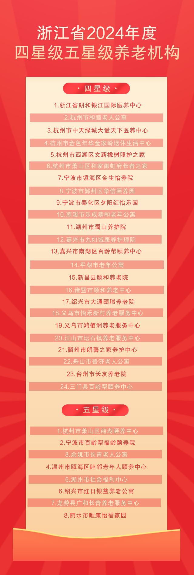 记者今天从浙江省民政厅获悉,浙江省2024年度四星级、五星级养老机构评审结果刚刚揭晓。2024年,浙江共有32家养老机构新评为四星级、五星级,其中四星级24家,五星级8家。这是浙江自2021年启动养老机构等级评定工作以来,四星、五星养老机构评定数量最多的一届。上“星”背后,释放什么行业信号?能给老年朋友带来哪些利好?