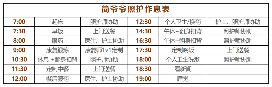 照护团队深知机体恢复健康,离不开营养的供给,便根据爷爷的胃肠情况以及用餐习惯,特别定制三餐和点心:水果蒸着吃,蔬菜打糊吃,为了加强口感,软烂的米饭蛋肉类,捣碎吃。后期根据爷爷体重变化情况,逐步增加更好吸收的肠内营养液,再配合营养膳食,让简爷爷的身体有了更好的恢复,面色也红润了许多。