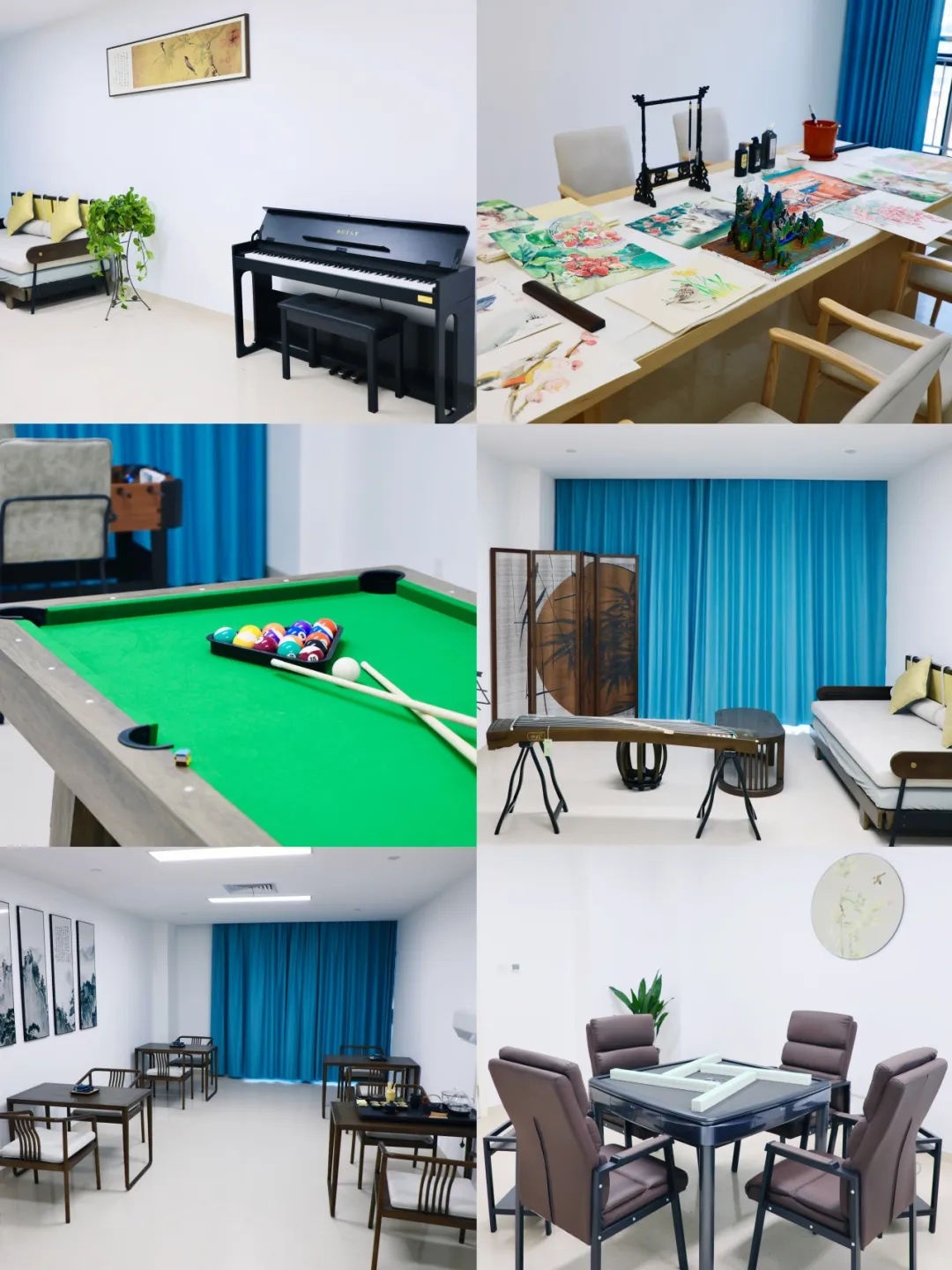 配备多元化的休闲娱乐设施与项目,涵盖健身器材、琴棋书画、茶道影视和别具一格的趣味菜园;
