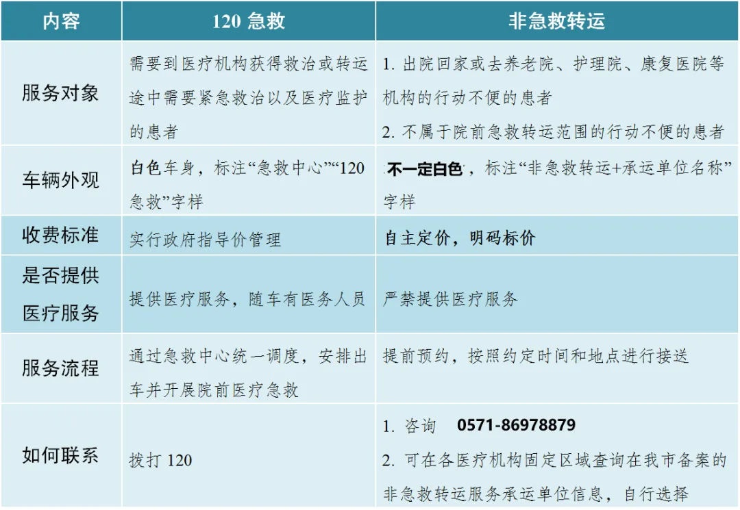 答:120院前医疗急救是政府举办的公益性事业,是基本公共服务重要内容,由急救中心及其急救站按照统一指挥调度,在患者送达医疗机构救治前,在医疗机构外开展的以现场抢救、转运途中紧急救治以及监护为主的医疗活动。而非急救转运是市场化运作,主要提供助行转送,是为满足群众个性化的转送服务需求,转送途中基本不需要医疗干预。具体区别可见下表:
