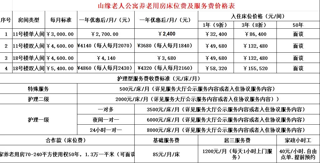 杭州山缘老人公寓收费标准: