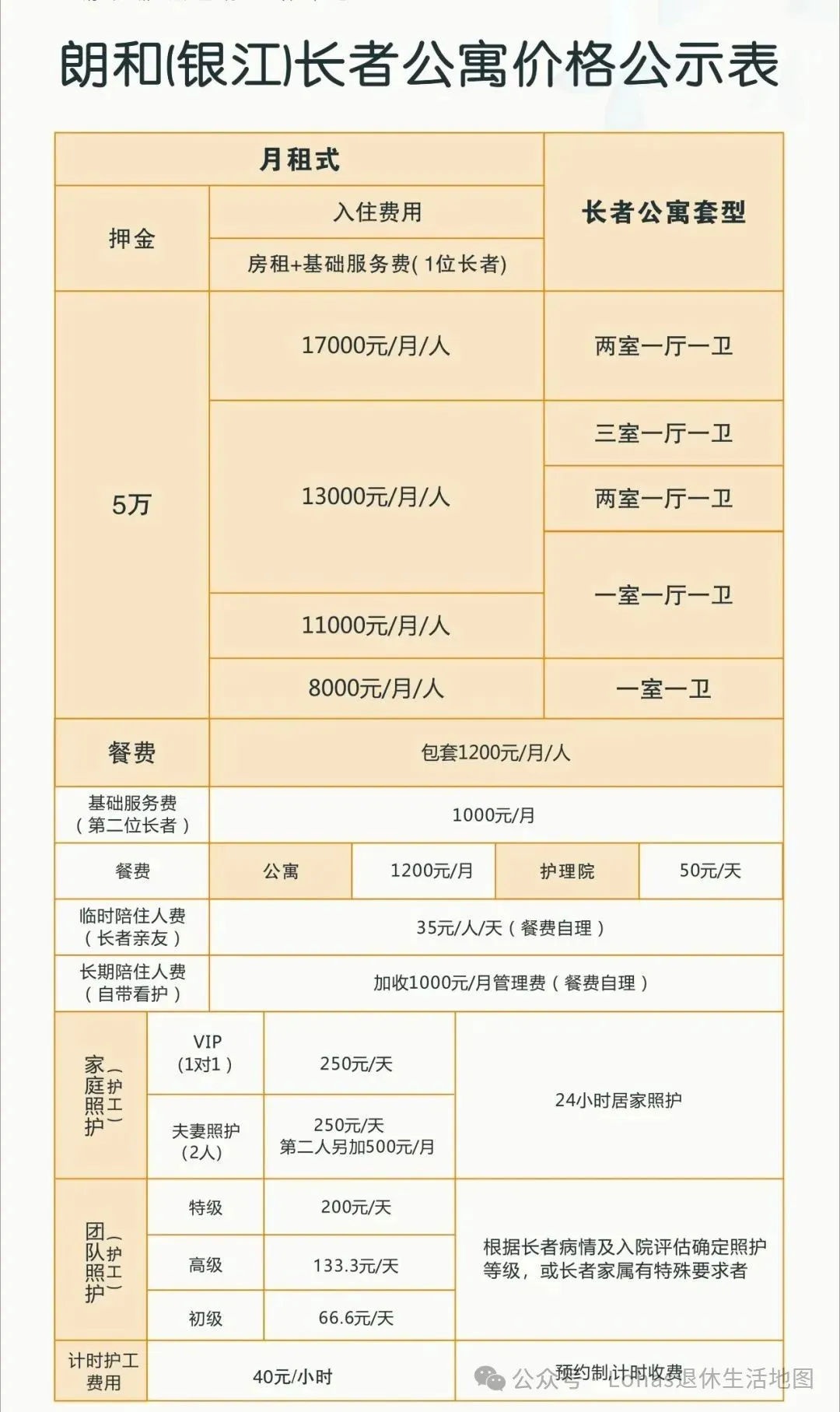 项目总投资约5亿元,总建筑面积约4万平方米,银江北楼共17层,提供151套长者公寓和198张护理院床位;中心内设有3000平方米娱乐休闲配套。