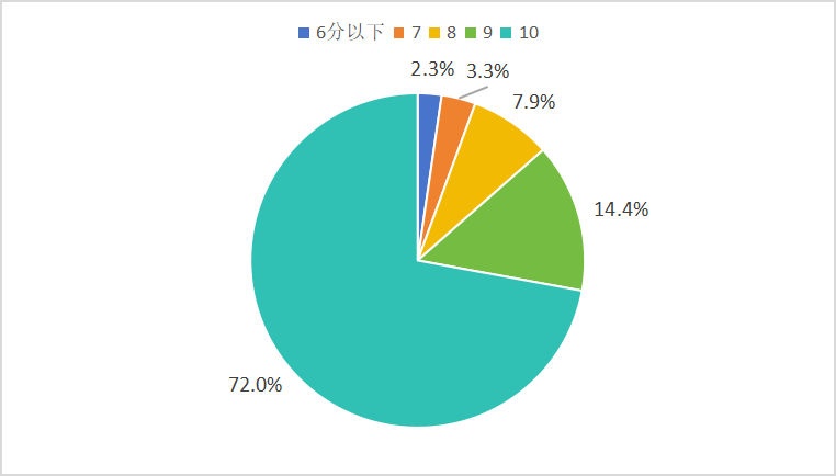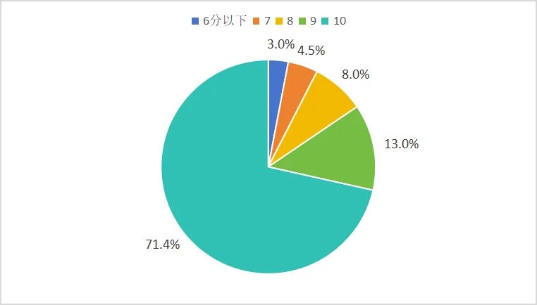 49.8%养老机构护理费用为1000-3000元/月;其次是1000元/月以下,占比37.8%,3000-5000元/月的护理费用占比10.5%。消费者对护理费价格的总体评价较满意,评价8分以上的占比为95.1%。