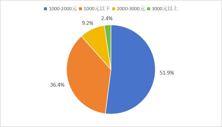 51.9%养老机构餐饮费用在为1000-2000元/月之间;其次是1000元/月以下,占比为36.4%。消费者对餐饮费价格的总体评价较满意,评价8分以上的占比为94.3%。