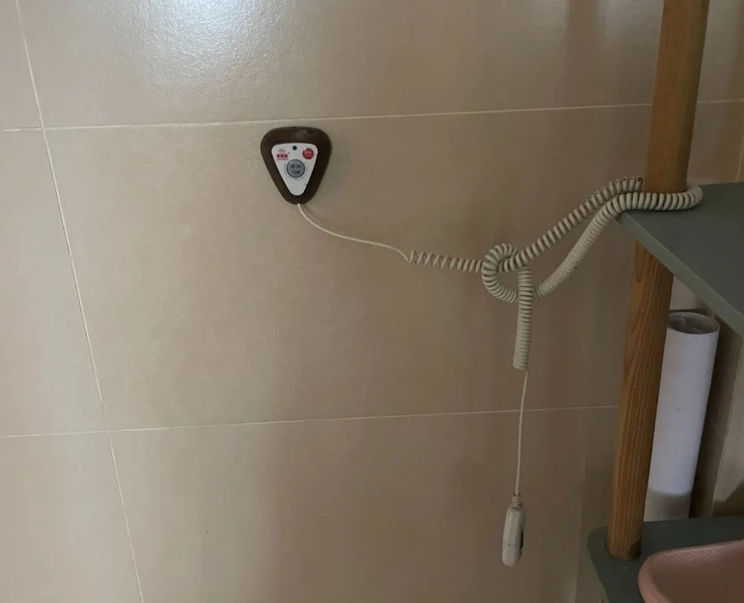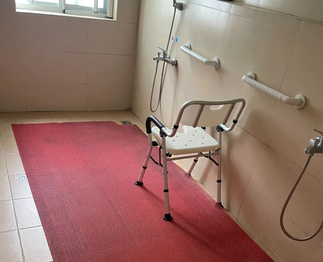有安装紧急呼叫系统,淋浴间有扶手和防滑垫,避免老人摔倒。