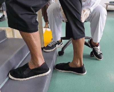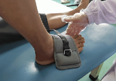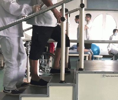 康复三区医护以及治疗师对爷爷进行了评估,根据评估结果制定了一系列治疗方案。袁晶晶发挥自身所学、潜心钻研制定陈爷爷的训练方案。针对陈爷爷膝过伸、足下垂、足内翻问题,设计并实施了腘绳肌肌力训练、踝关节的牵伸、斜板的站立等。训练半个月后,陈爷爷运动功能有了进步,并由主动踝背屈过渡到抗阻踝背屈,同时慢慢训练本体感觉、站立平衡、膝关节的控制,一步步提高陈爷爷的运动功能,这些都是在为陈爷爷步行训练打下基础。
