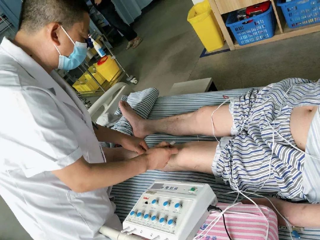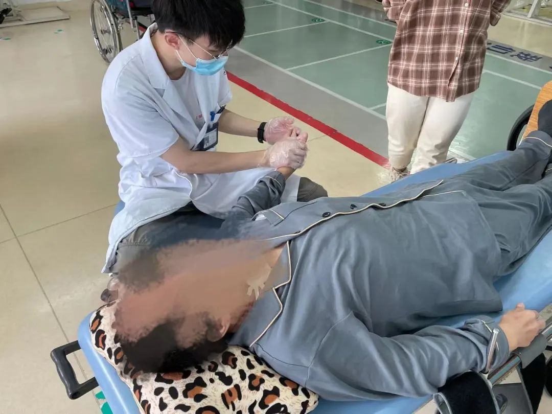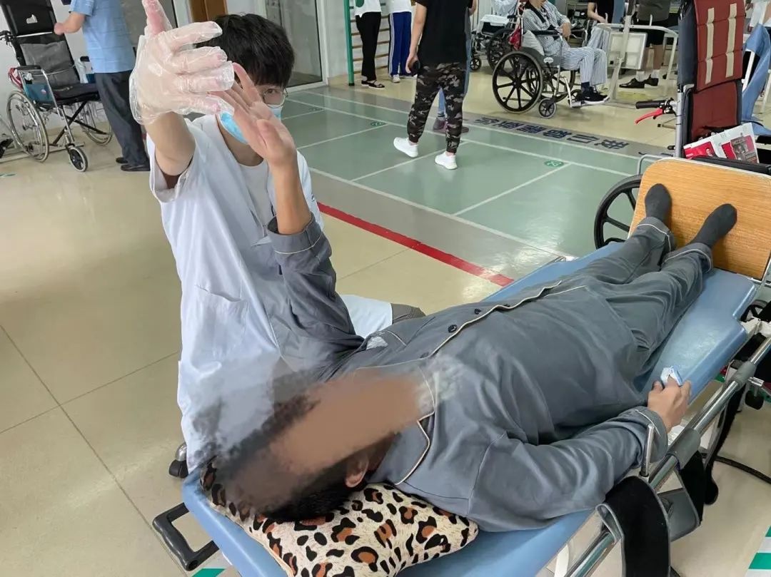 除了针灸以外,我院还针对李先生的病情制定了一系列的特色康复计划,运动疗法、呼吸训练、吞咽训练等等,在运动疗法内治疗师还根据病区加入了主动运动,关节松动术等康复手段