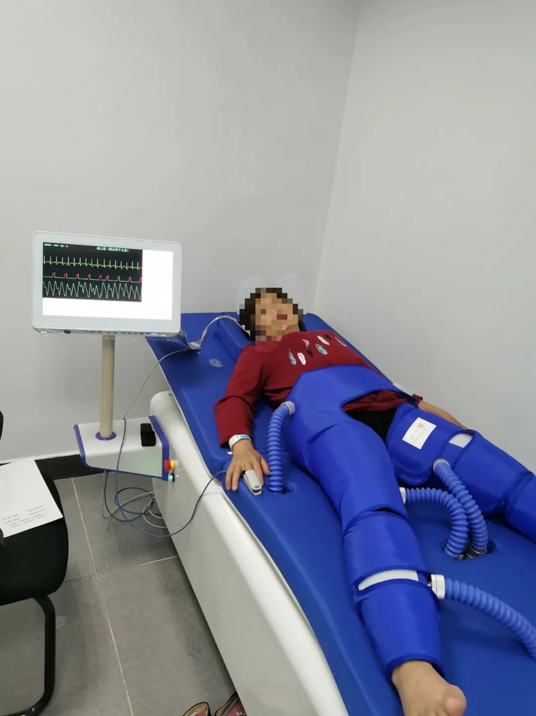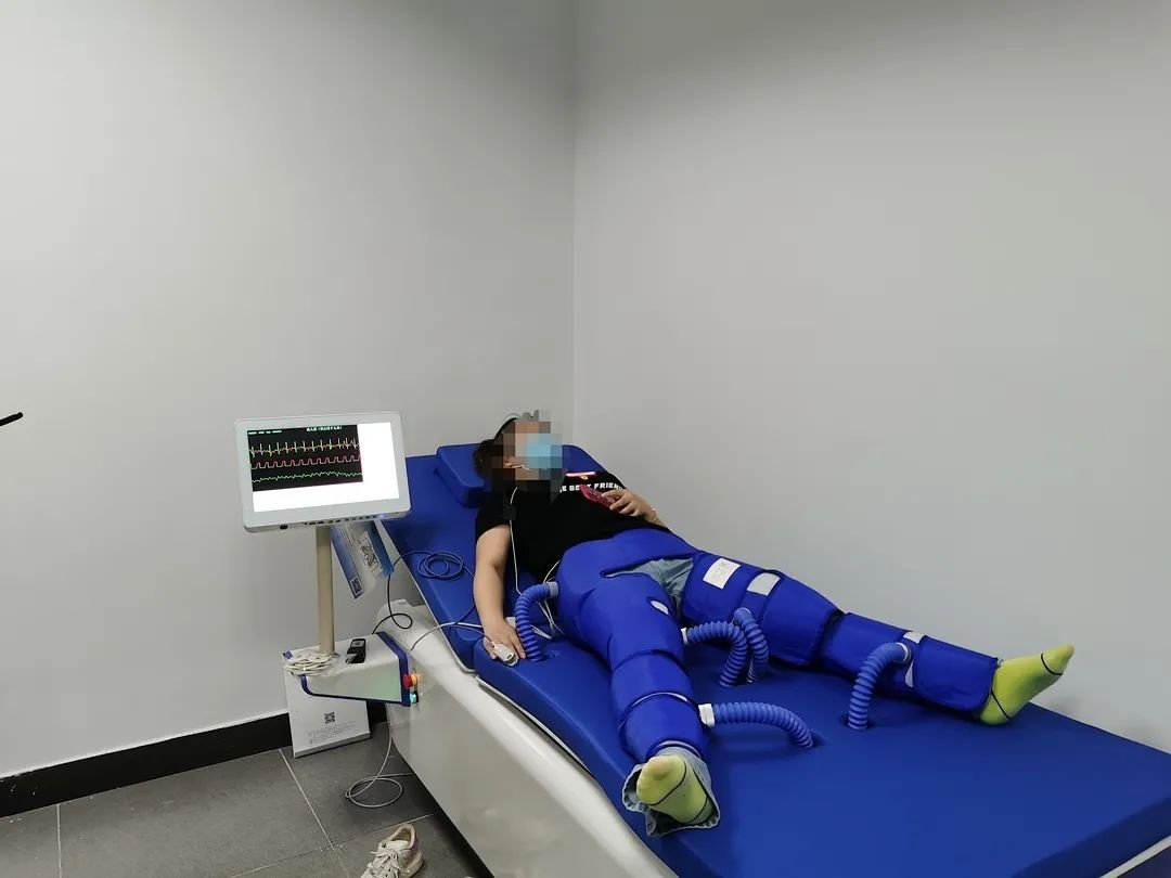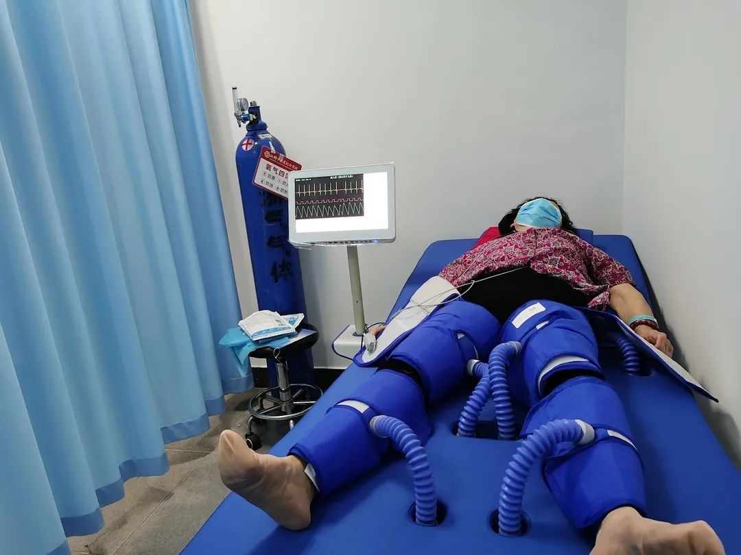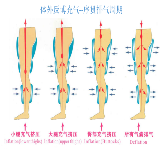 增强型体外反搏治疗是用外力促进血液循环的一种辅助治病方法,是一种治疗多种缺血性疾病的无创性辅助循环技术。它通过在患者的小腿、大腿及臀部分段包裹特制的气囊套,在心电R波的触发下,气囊由下至上序贯充气,挤压人体下半身的动脉系统,在心脏的舒张期将血流驱回至人体上半身,从而改善心、脑等重要脏器的血流灌注,同时使双下肢静脉回心血流增加,从而提高心输出量。