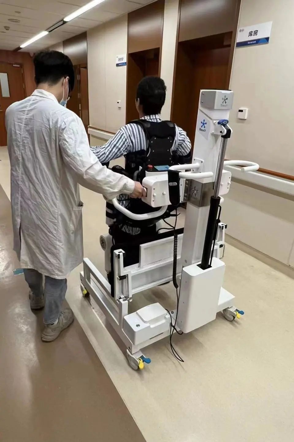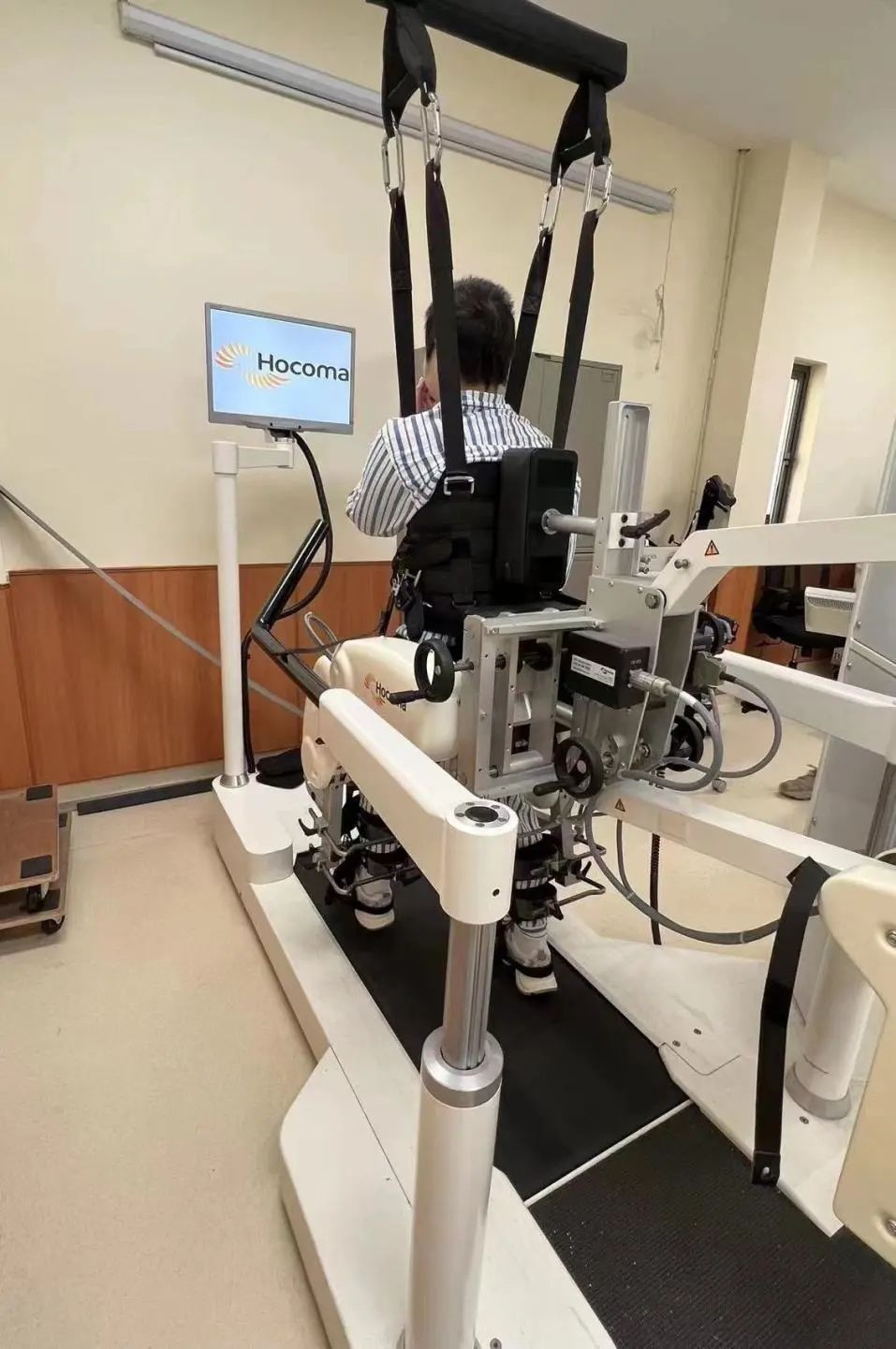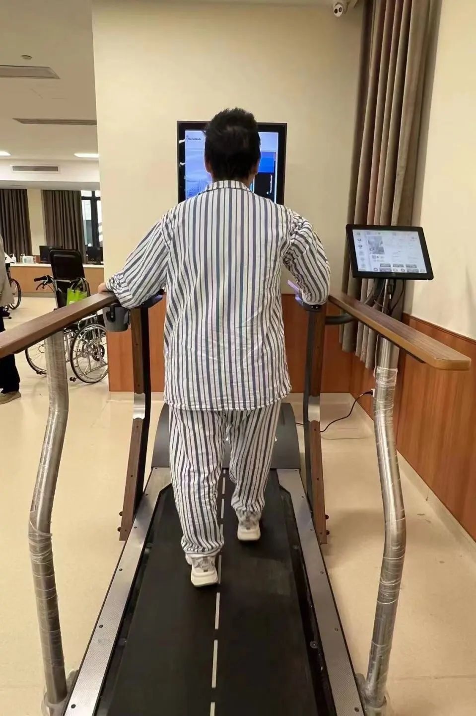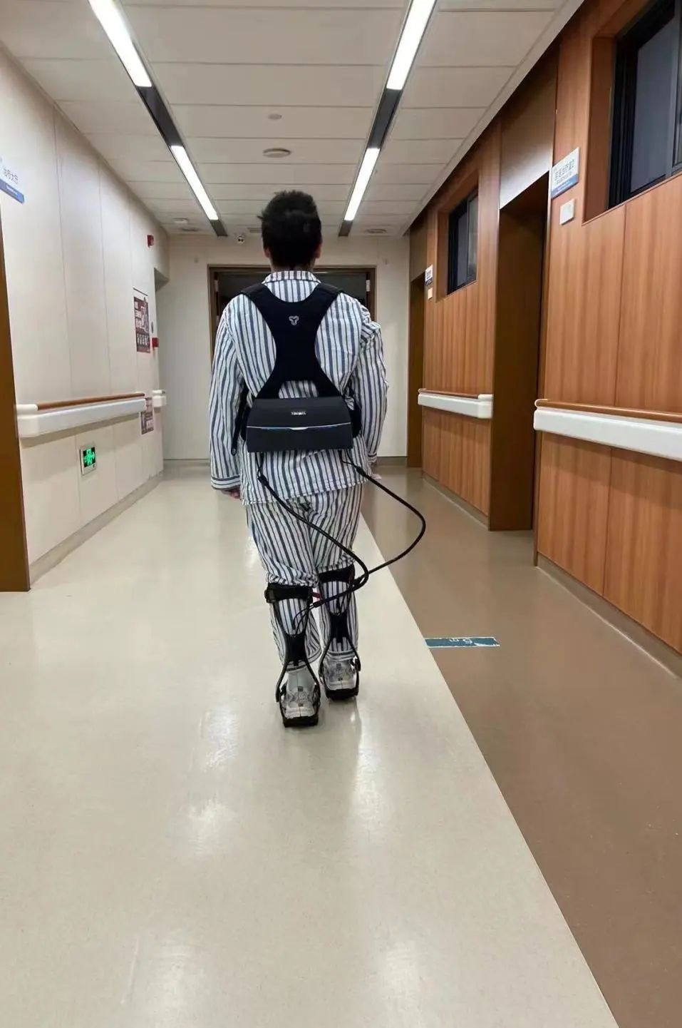 因入院时精神烦躁,配合度差,小华只能进行床边被动运动,待情况好转后,小华便能到治疗室进行康复训练。经过系统评估,裘宇杰运动康复治疗师确定康复治疗方案,利用下肢机器人在减重状态下进行外力辅助步行训练;待腿部力量增强后,更为便捷的外骨骼机器人托举着小华在治疗室内“散步”;渐渐地,在治疗师的指导下可以依靠自己的力量挪一挪步子了,小华开始在肌肉外甲帮助下改善步态。经过一段时间的治疗后,小华恢复了一定程度的步行功能,可以在步态分析仪上进行自主步行训练,治疗师根据跑台记录的步行参数对她提供针对性的指导,小华的运动耐力和步行功能得到了进一步提升。