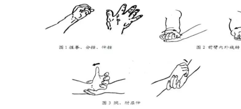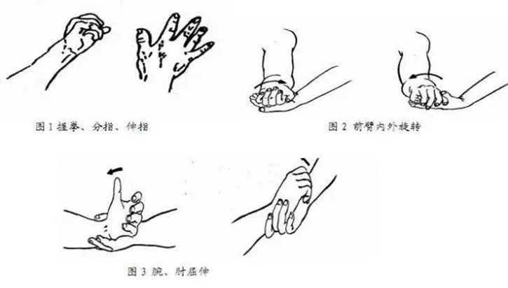 (1)固定后即可做伸屈指、掌、腕关节活动,患肢做主动肌肉收缩活动(见图 1、图2、图 3)。