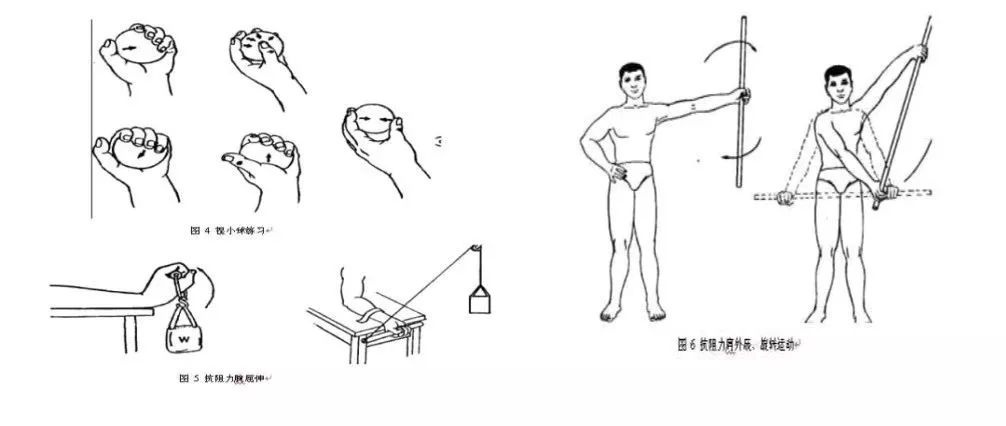 (2)中期(2-4周)可增加捏小球,抗阻腕屈伸运动及被动或助力的肩外展、旋转运动(图4、图5、图6)等。