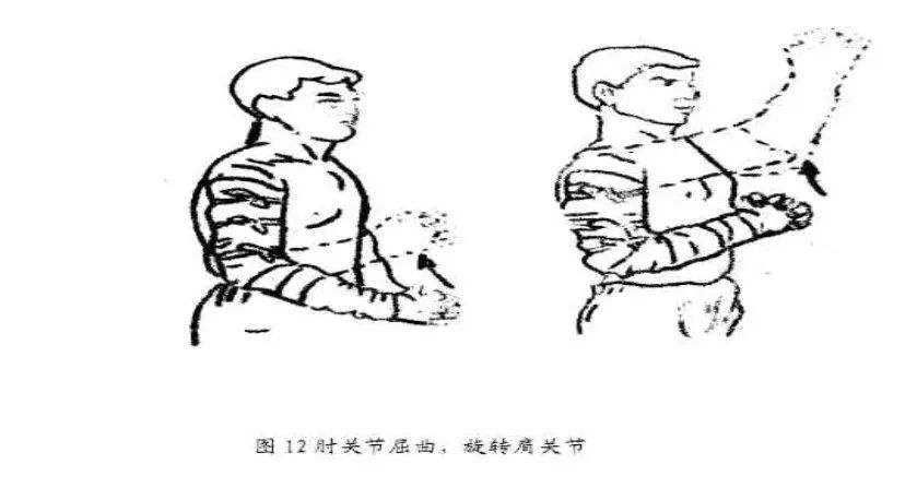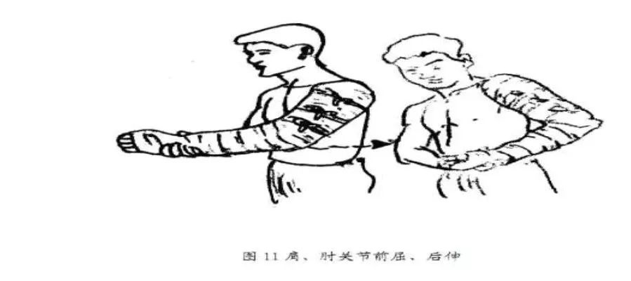 (2)肩、肘关节的活动:伤后 2-4周肿胀消除后除继续以上训练外,应逐渐做肩、肘关节活动,其方法是:将健手托住患肢腕部,做肩、肘前屈、后伸,然后屈曲肘关节,同时上臂后伸(见图 11)。