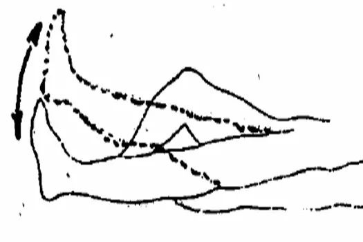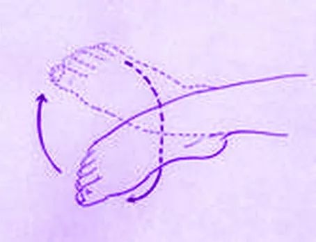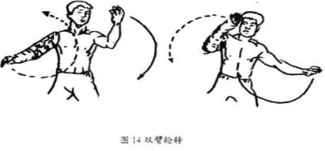 (5)双臂轮转:患肢屈肘,前臂置于胸前,掌心向后、向上;健侧上肢伸直,外展于体侧,掌心向下。患肢向外上方经外下方再向内划弧圈,回至原处;同时健侧上肢向下经内上方向外划弧圈,回至原处(图14)。如此循环往复。此法可使肩、肘、腰、腿、颈部均可得到锻炼。以上锻炼方法每次 15 分钟,每天 3-4 次。