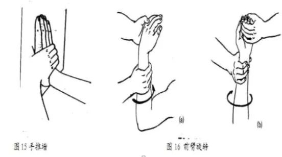 (3)骨折愈合后的锻炼:骨折愈合后,增加前臂旋转活动及用手推墙动作,使上、下骨折端产生纵轴挤压力(图15、图 16)。