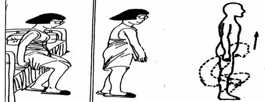 (4)在骨折恢复期,术后 1个月要加强髋、膝、踝部的肌力,以恢复行走能力,加强下肢的稳定性。主要方法是进行坐位与站位转换活动练习,以锻炼髋关节;踝关节主动屈伸、旋转活动,以及下蹲起立。(图20、图 21)