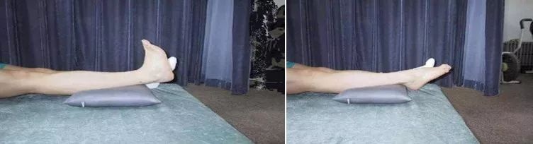 躺或坐床上,下肢伸展,大腿放松,缓缓勾起脚尖,尽力使脚尖朝向自己,至最大限度时保持10秒钟(图1),然后脚尖缓缓下压,至最大限度时保持10秒钟(图2),然后放松,这样一组动作完成。稍休息后可再次进行下一组动作。反复地屈伸踝关节,最好每个小时练习5分钟,一天练五至八次。