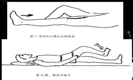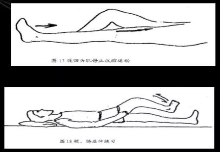 (1)术后早期疼痛稍减轻后,病人即可开始练习股四头肌静止收缩,髋、膝、踝、趾关节主动运动。(见图17、图 18)