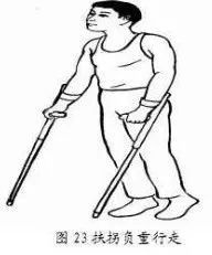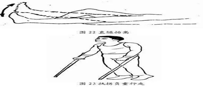 (2)固定后 3-5天可两腿直腿抬高和膝关节屈伸运动,扶拐进行患肢负重练习。(图 22 图 23)