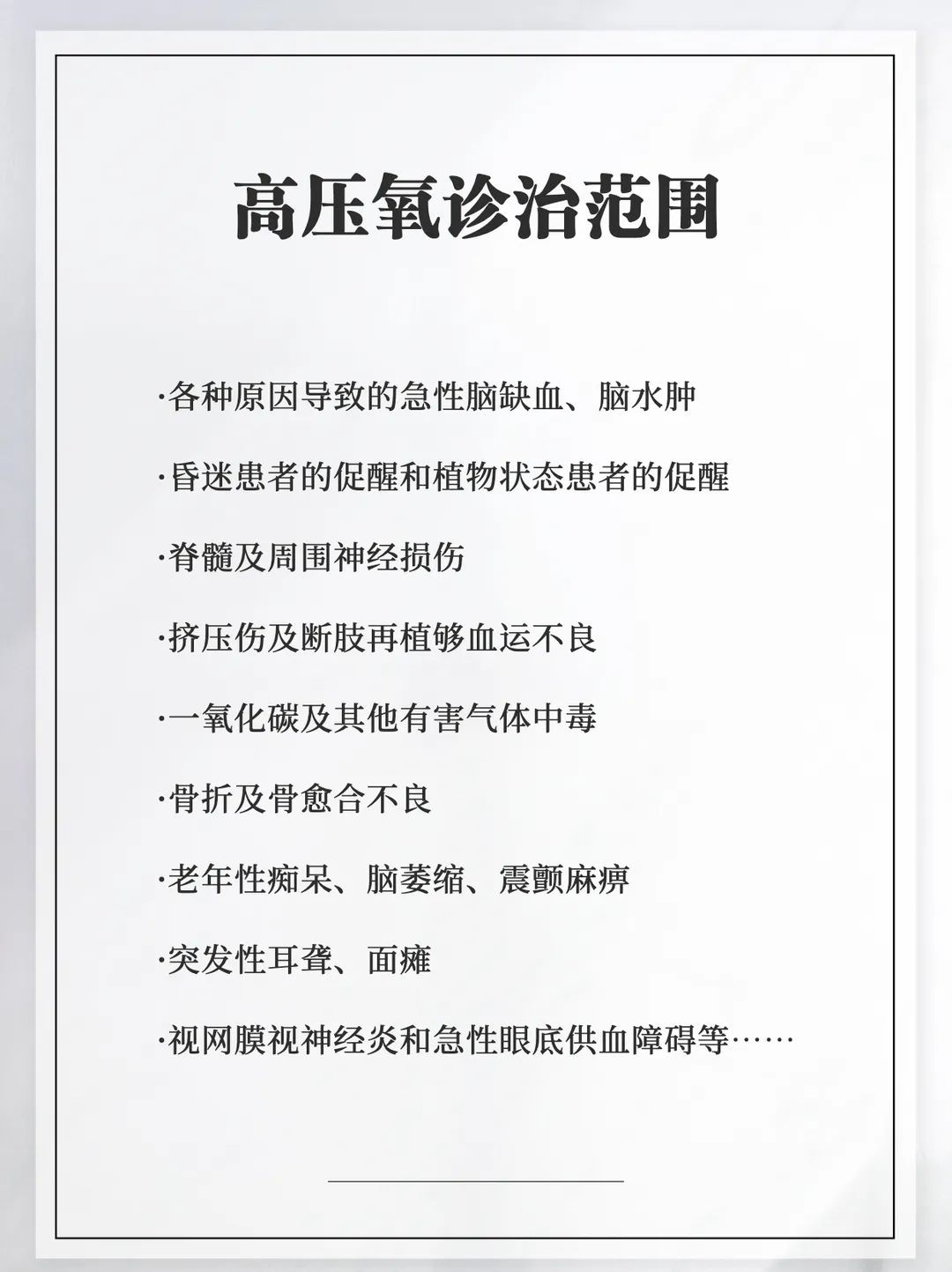 高压氧治疗是患者在高于一个大气压的环境里,吸入100%的氧治疗疾病的过程。高压氧能在短时间内迅速提高体内血氧含量、氧分压和血氧弥散,从而达到改善组织缺氧状态,促进体内各脏器功能恢复,起到治疗疾病的作用。