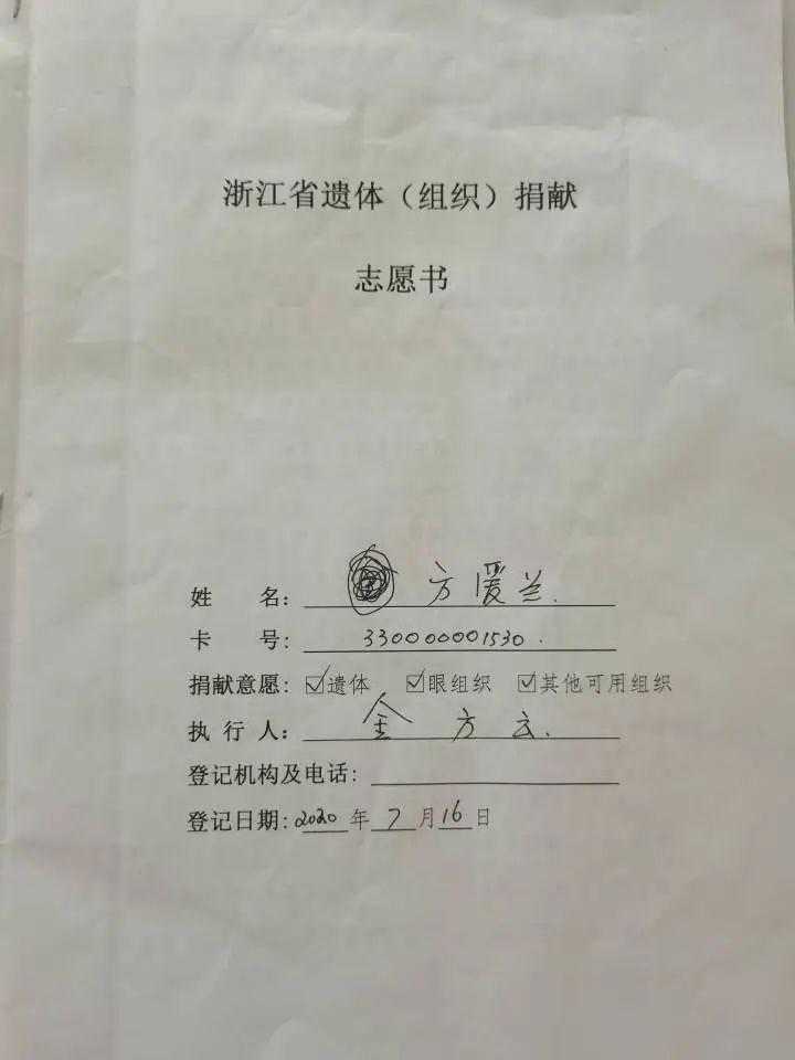 2020年7月16日,老人在“遗体捐献志愿书”上郑重地签下了自己的名字。