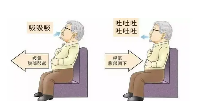 坐在椅子上,上半身稍向前倾,用手撑着上半身,照顾者将手放在病友的腹部,病友开始吸气,肚子膨胀后会将照顾者的手推回。嘴微微张开,慢慢吐气,照顾者要确认病友在吐气时腹部是否有缩回去。