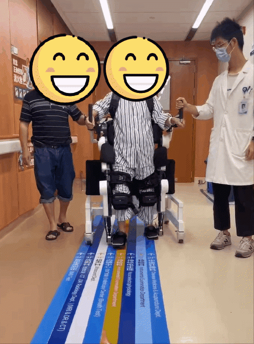 在患者达到一定站立位平衡条件及具备下肢步行条件后循序给予了外骨骼机器人辅助下的步行训练、步态训练及后期的上下楼梯训练。