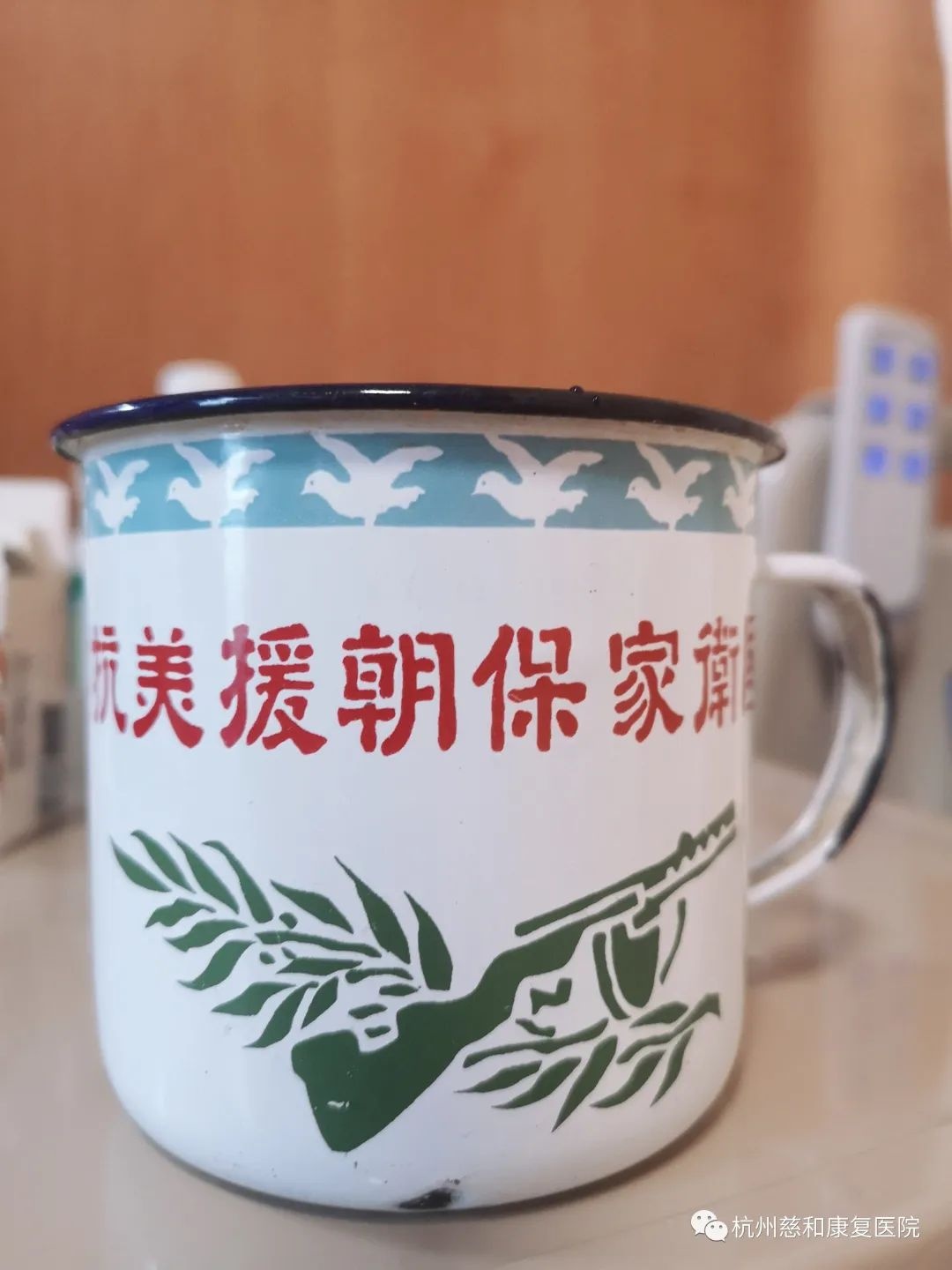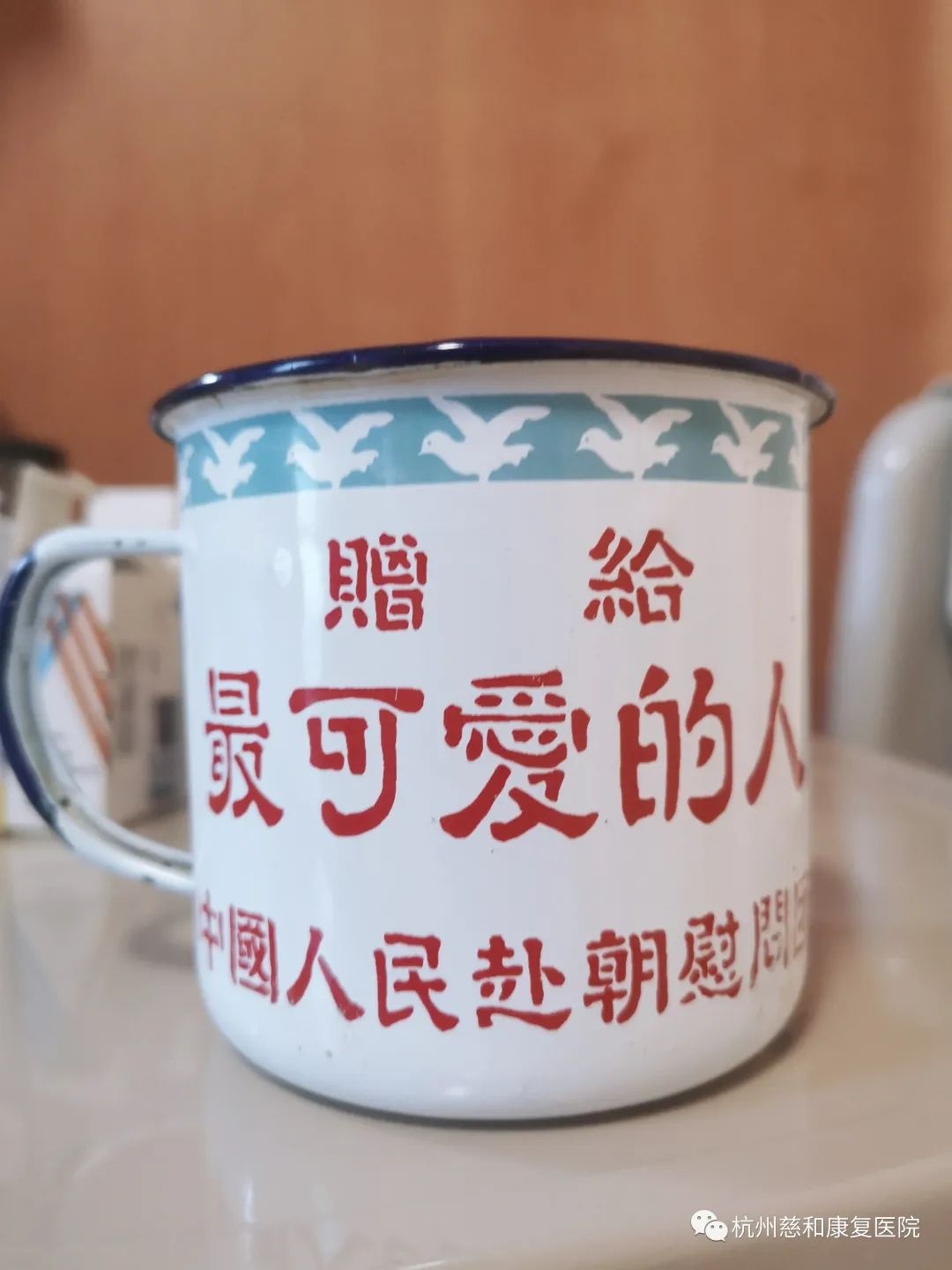 沈爷爷曾经是军人,参加过抗美援朝,杭州本地人,今年89岁,和老伴一起住在慈和康复医院五楼病房。这一天室外时不时飘着雨,我们来到了五楼,听科室护士长讲爷爷去社区了,是登记抗美援朝70周年办理尚缺的资料啥的。当我们推门入内时,他的老伴雷奶奶正躺在床上,自己慢慢能坐起来,和大家一起聊了聊。雷奶奶的床头柜上还摆着当年志愿军慰问时赠予的纪念杯,老人家一直装水饮用。